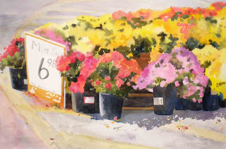 15x22 watercolor on Kilimanjaro 140 lb cold press paper from a photo I took a few years ago in Home Depot's parking lot by their greenhouses. It was October and the beginning of cooler weather and the perfect time to plant chrysanthemums.
