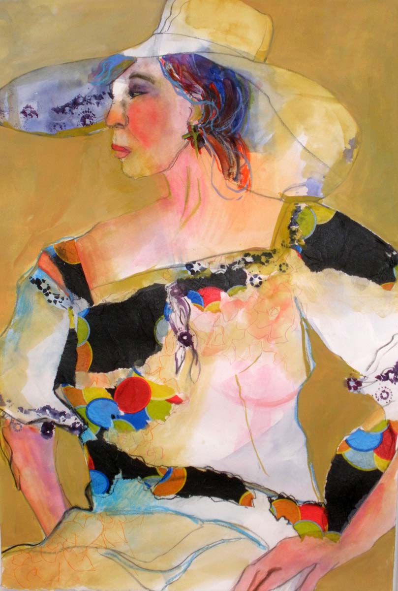 15x22 Arches hot press 140 lb paper with charcoal drawn views of the same model. Collage added to middle ground and to her skirt while gold watercolor makes up the background. A tennis shoe imprinted handmade stamp is the pattern seen on her blouse. I used the Matisse acrylic paint for neutral foreground made by Derivan in Australia. This is the last one done in Liz Hill's class and is the most unusual.