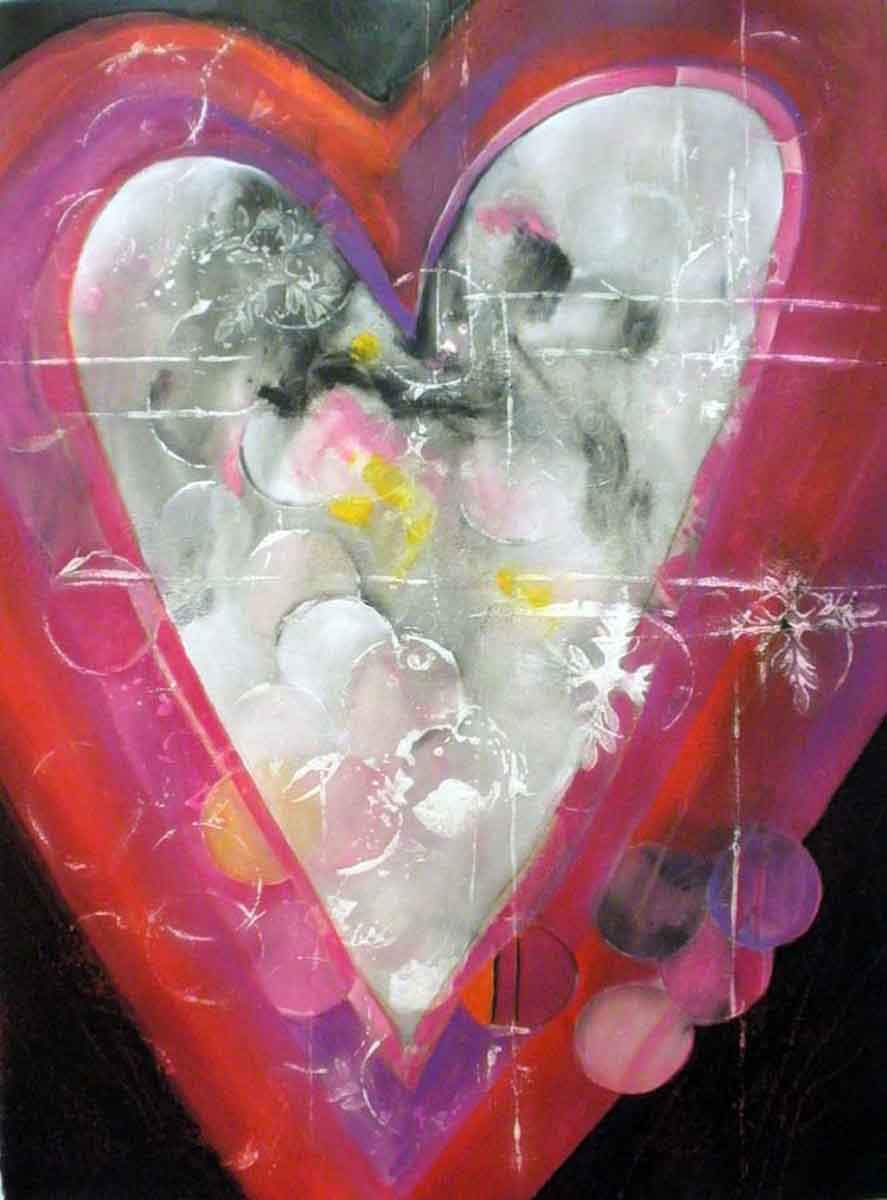 30x22 acrylic, wax crayon, and ink on 140 lb cold press watercolor paper, a heart abstracted first then defined with more detail inside later. This painting has been SOLD.