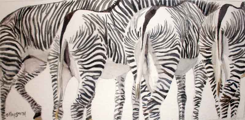 3.5x7 watercolor of four grown zebras standing together discussing the day's events. Today I painted them on Canson 140 lb cold press paper (photo from WetCanvas Weekend Drawing Event). With the WDE, participants are given 2 hours to choose and paint their subject, then post the results at that time limit even if unfinished. This work has now been SOLD.