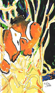 8.5x5.5 Montana acrylic markers and Uniball Vision Elite pen on Bienfang sketchbook done today as a timed exercise on WetCanvas. There were two clownfish in the ref Connie provided but I eliminated one due to space, and did not sketch in all the coral noodles.