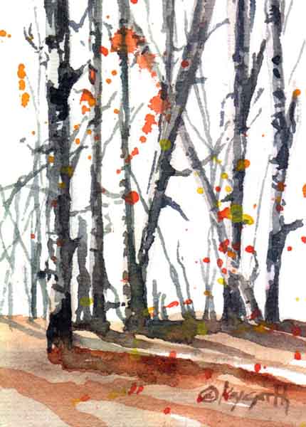 12x9 watercolor done last week on Canson 140 lb cold press paper, an imaginary grouping of trees and a background of multilayered fall colors. The golden hues were put in wet in wet quickly and when dry the trees stark branches, trunks, etc., were added with a script liner #1 brush in warm sepia.