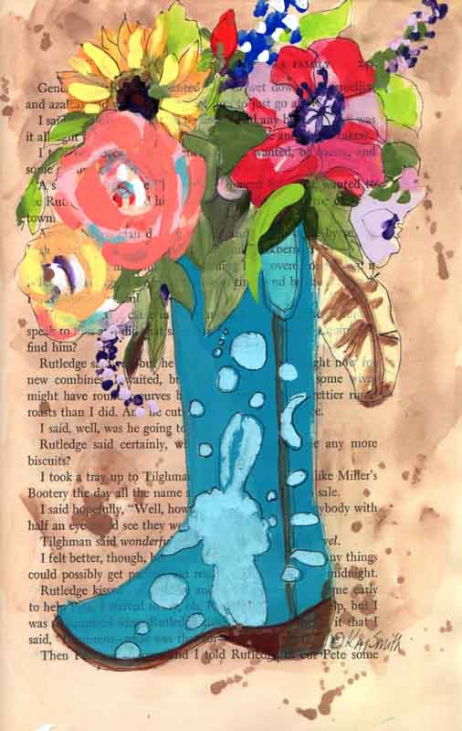 8.25x5.25 acrylics in junk journal done a few weeks ago after painting the larger boot commission. In this imaginary still life the viewer's attention is focused on the blue contrast with the yellow and orange flowers. Only a few more pages and the journal will be finished.