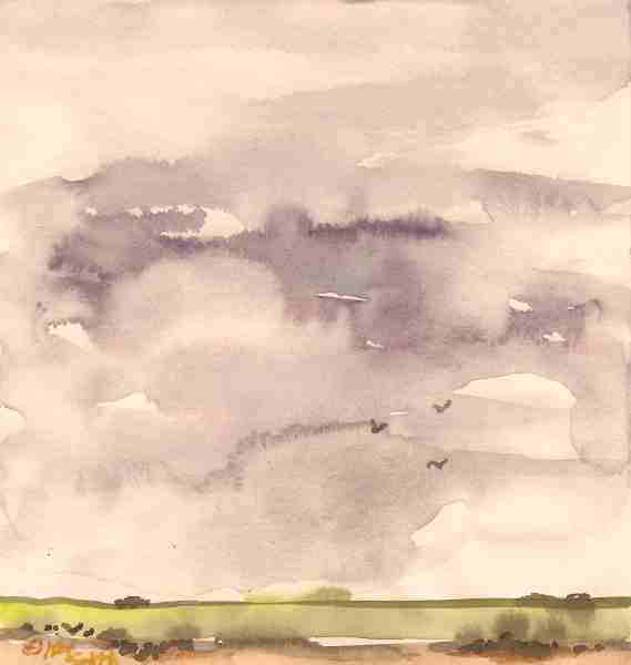 6x6 watercolor on 80 lb sketchbook paper in Masters Touch book, another imaginary cloudscape done last Monday as a class demo. Here I've used one color for the clouds, Moonglow by Daniel Smith, and lots of water. The low horizon features green pasture and distant small bushes or trees, all hoping for more rain to fall.